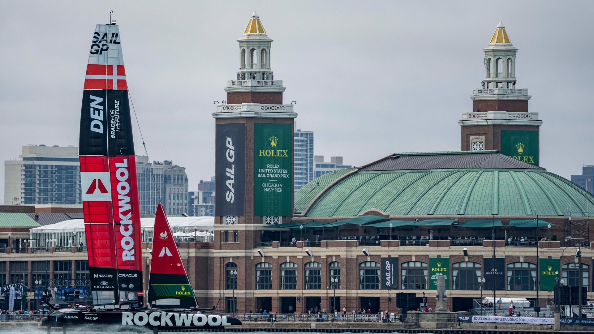 ROCKWOOL Denmark SailGP Team foiling (flying) over the shallow water around Navi Pier in Chicago.