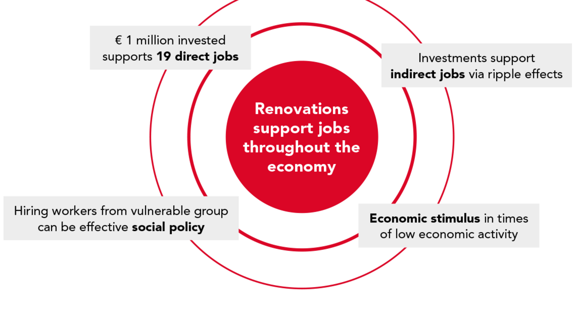 Fun fact: Did you know that every €1 million invested in renovation can be expected to support approximately 19 jobs in the construction sector (Euroace, 2012)? As such, by scaling up to a large-scale project of €100 million, 1,900 jobs could be created as a result. By providing new projects that require considerable time and work to complete, a significant level of job security is ensured for the employees involved.