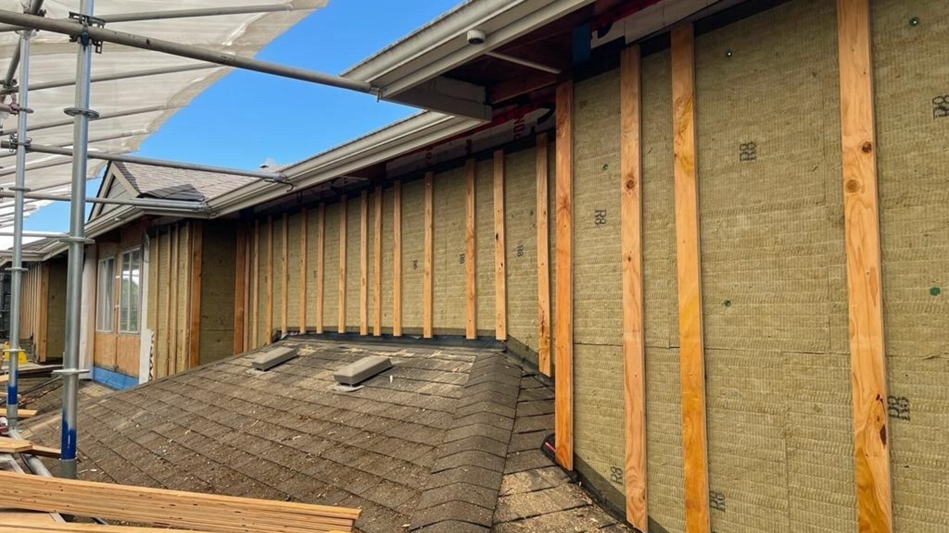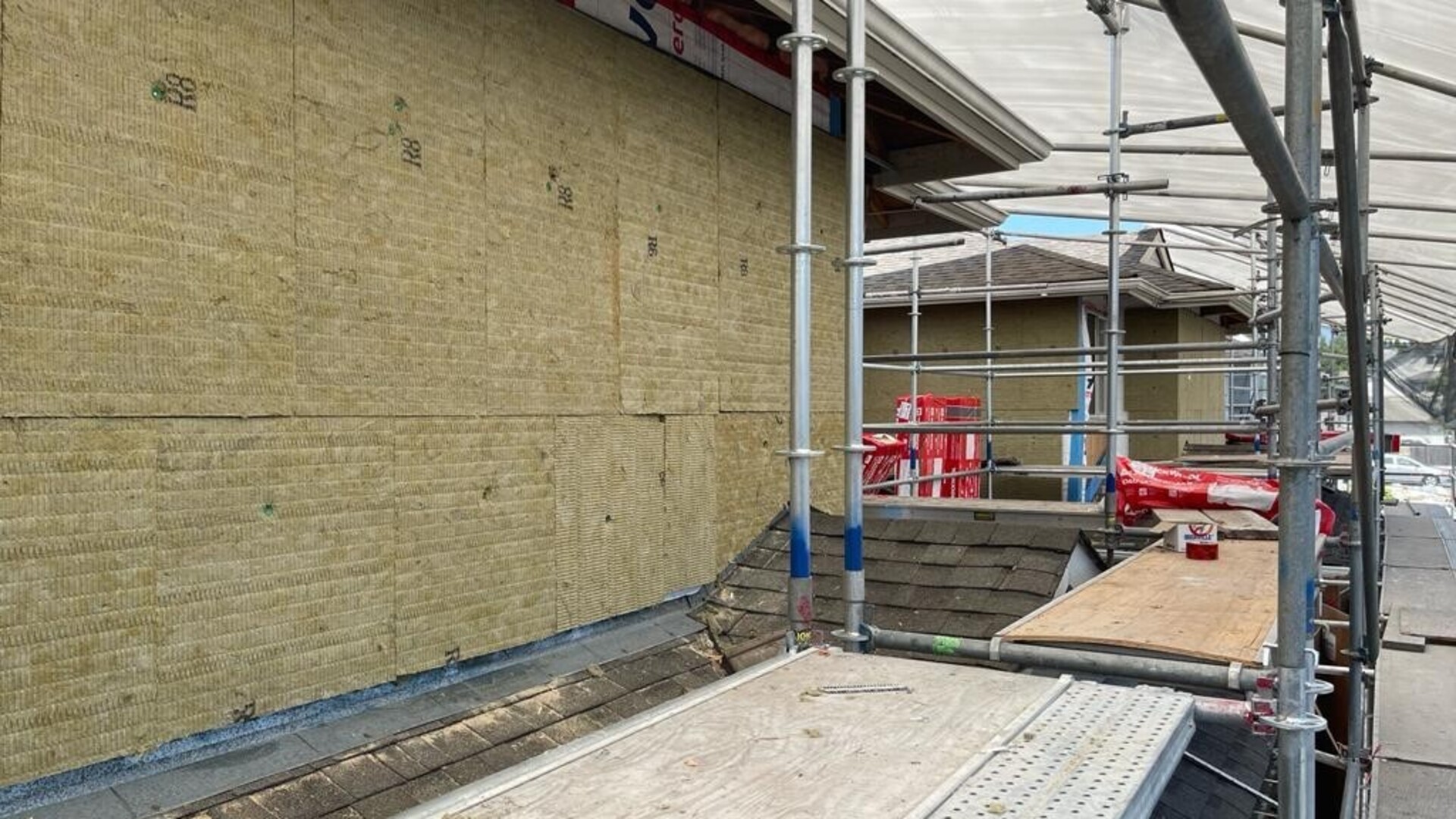The building envelope was upgraded, and a number of building components were replaced. A key strategy to improving thermal and moisture performance of the exterior wall system in each of the complex’s buildings was the installation of a 2” layer of ROCKWOOL Comfortboard® 80 continuous exterior insulation outboard of the sheathing to create a continuous thermal break and reduce thermal bridging. This will serve to increase the thermal performance of the wall assembly, bringing it in line with current BC Building Code. The team also took into account BC Energy Step Code by integrating some Passive House principles with the aim to apply best practices while also future-proofing the building. A more efficient building envelope will result from the addition of the stone wool continuous insulation since thermal bridging can reduce thermal performance by up by as much as 30 – 50 per cent.